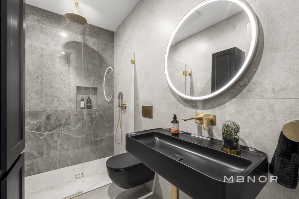 Accommodation & Retreat Ascend the glass-balustrade staircase and grand chandelier to the upper-level retreat, where a third living zone (rumpus) features plantation shutters. Accommodation comprises five oversized bedrooms, all with walk-in wardrobes. The bathrooms continue the European design language with imported Italian wall tiles, stone basins, and elegant gold brass finishes, with the master ensuite including a two-person jet spa.