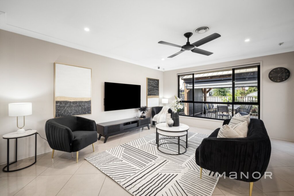 Downstairs offers a private bedroom complete with built-ins and a full shower - ideal for guests or multi-generational living. Multiple expansive living zones with ceiling fans create flexibility for both relaxed family time and vibrant gatherings, while a separate dining area elevates formal entertaining. Contemporary roller blinds add a refined finish throughout.